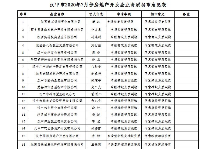 根据陕西省住房和城乡建设厅《关于下放房地产开发企业四级和暂定资质许可审批事项的通知》(陕建发〔2014〕128号)、《关于印发〈陕西省房地产开发企业资质管理办法〉的通知》(陕建发〔2019〕13号)和汉中市住房和城乡建设局《关于规范全市房地产开发企业四级和暂定资质申报有关工作的通知》(汉住建发〔2019〕66号)文件精神,我局对陕西建工梁州置业有限公司,汉中市锦周置业有限公司等18家公司申报的资质资料进行了初审。现将初审意见予以公示,公示期10天(2020年7月17日——2020年7月26日)。任何单位及个人如对公示意见有异议,可在公示期内向我局提出书面陈述,陈述材料需加盖公章或签署真实姓名及电话,逾期不予受理。