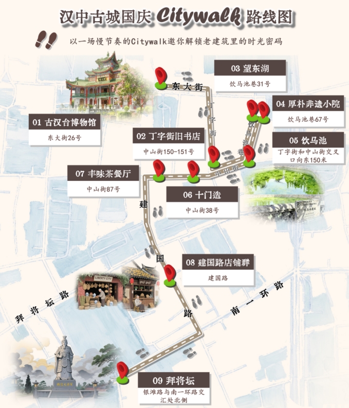 当国庆的红旗漫卷街巷,当千年的汉韵浸润古城,汉中——这座沉淀了“两汉三国”风华的国家历史文化名城,将以一场慢节奏的Citywalk,邀你解锁老建筑里的时光密码。无需疾行,不必追赶,只需循着青石板路,在一砖一瓦、一院一檐间,读懂汉中的过去与现在,在漫步中触摸砖瓦里的时光,在体验中感受汉韵里的风华。